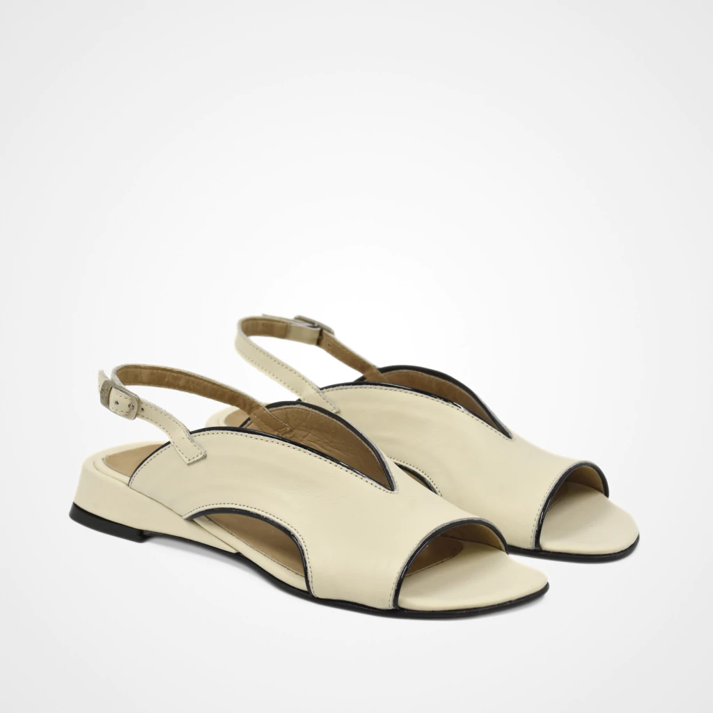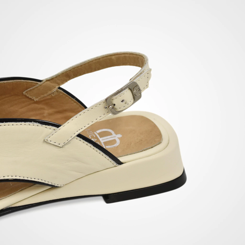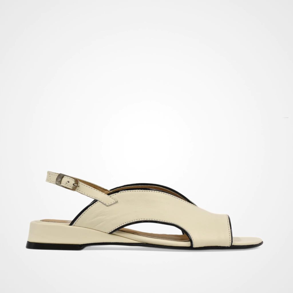 La sandalia Catalina en color ecru es una opción elegante y moderna para quienes buscan un diseño distinto sin resignar comodidad. Su corte superior con escote en “V” estiliza el pie y los ribetes negros le aportan un contraste sutil que realza su diseño.