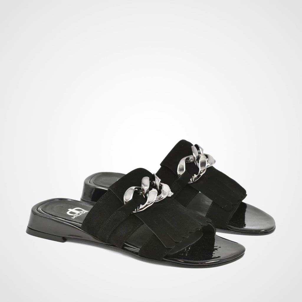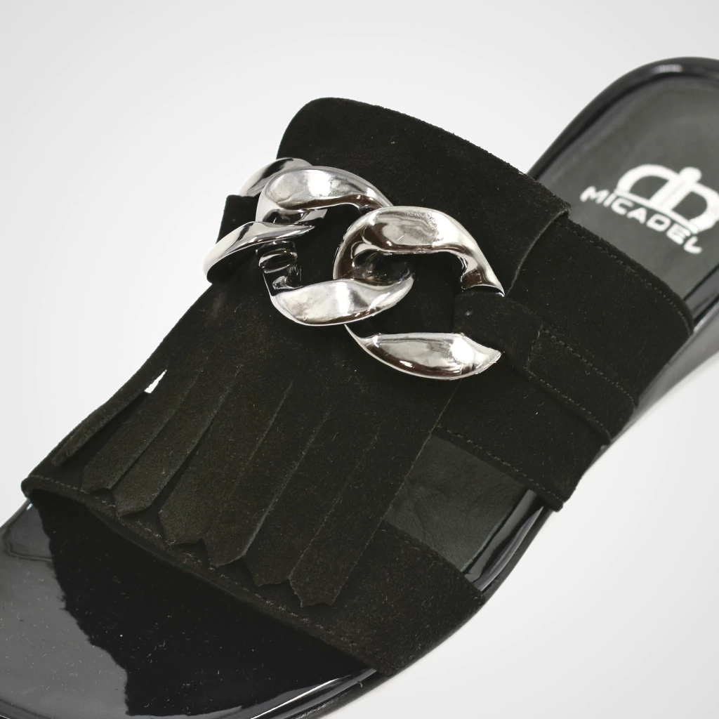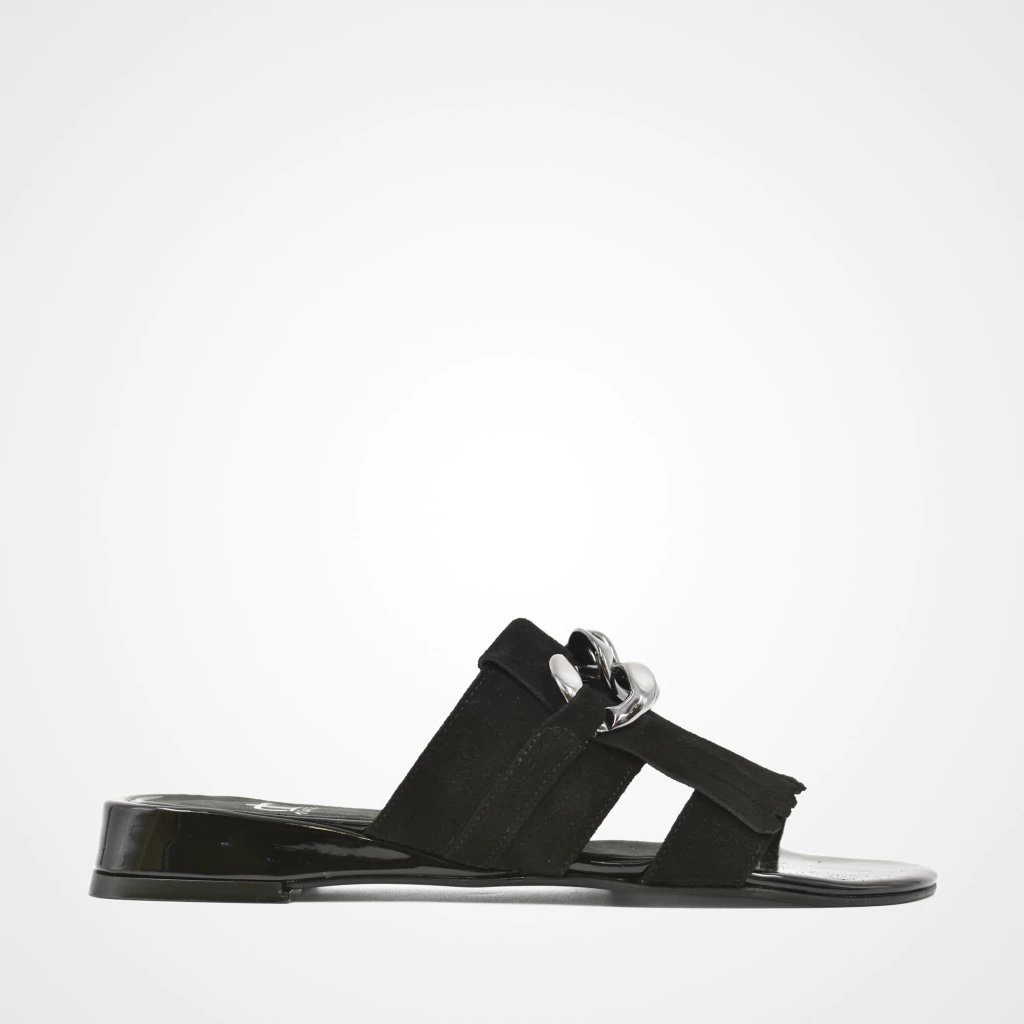 La sandalia Cereza en cuero negro es un modelo fresco y versátil. Su diseño se distingue por los flecos en la capellada y la cadena metálica, que le aportan un toque moderno sin perder comodidad.