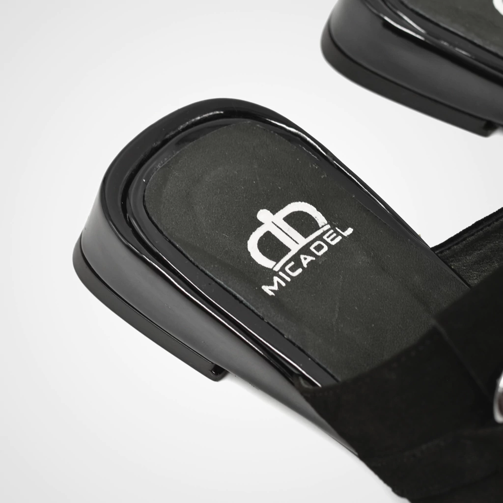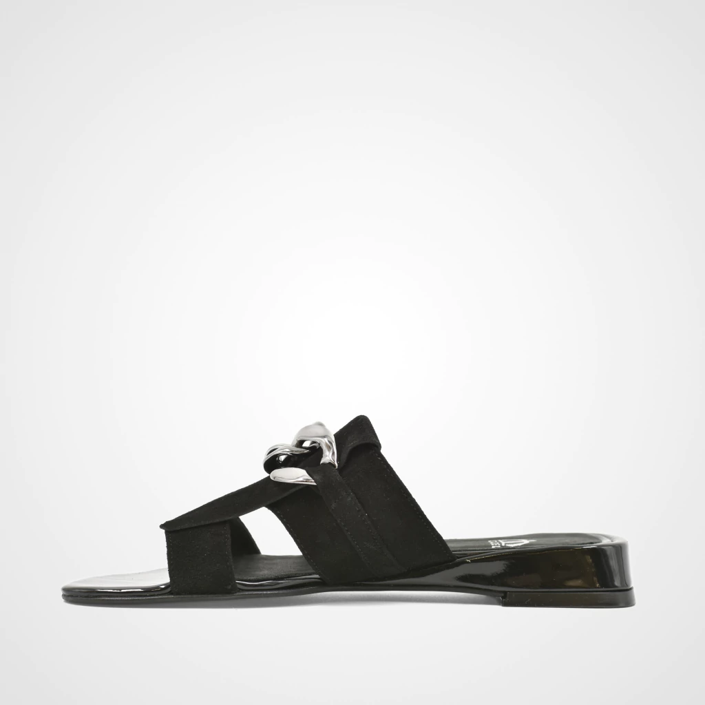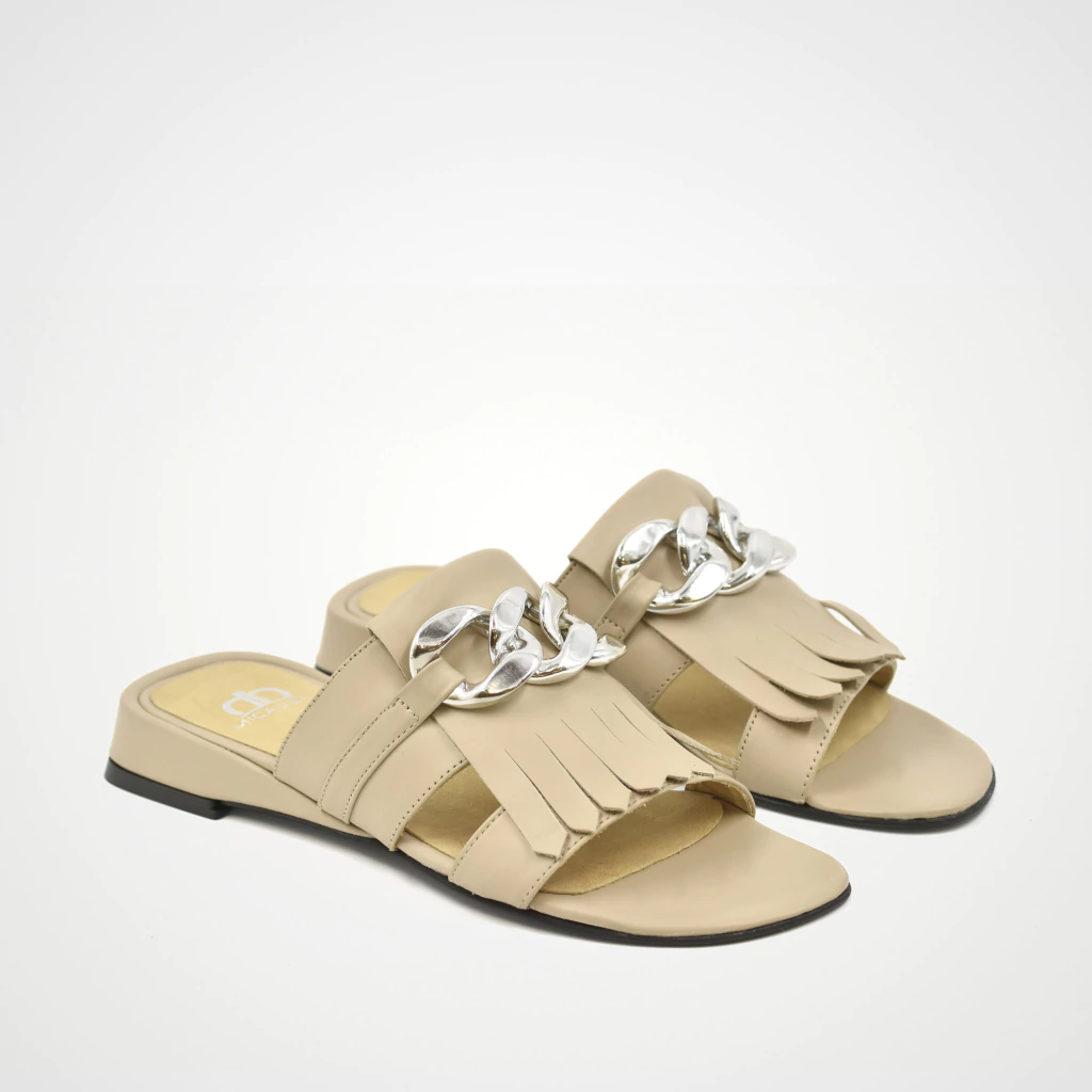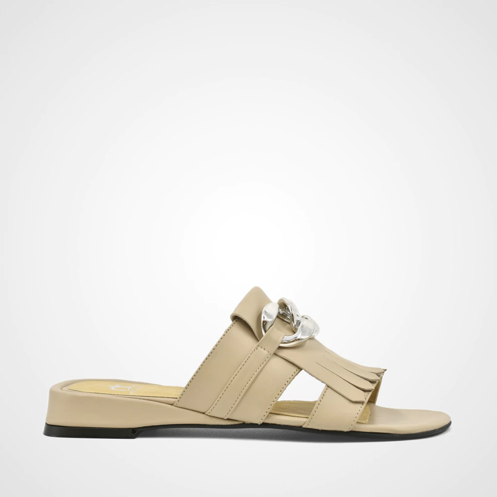 La sandalia Cereza en cuero negro es un modelo fresco y versátil. Su diseño se distingue por los flecos en la capellada y la cadena metálica, que le aportan un toque moderno sin perder comodidad.