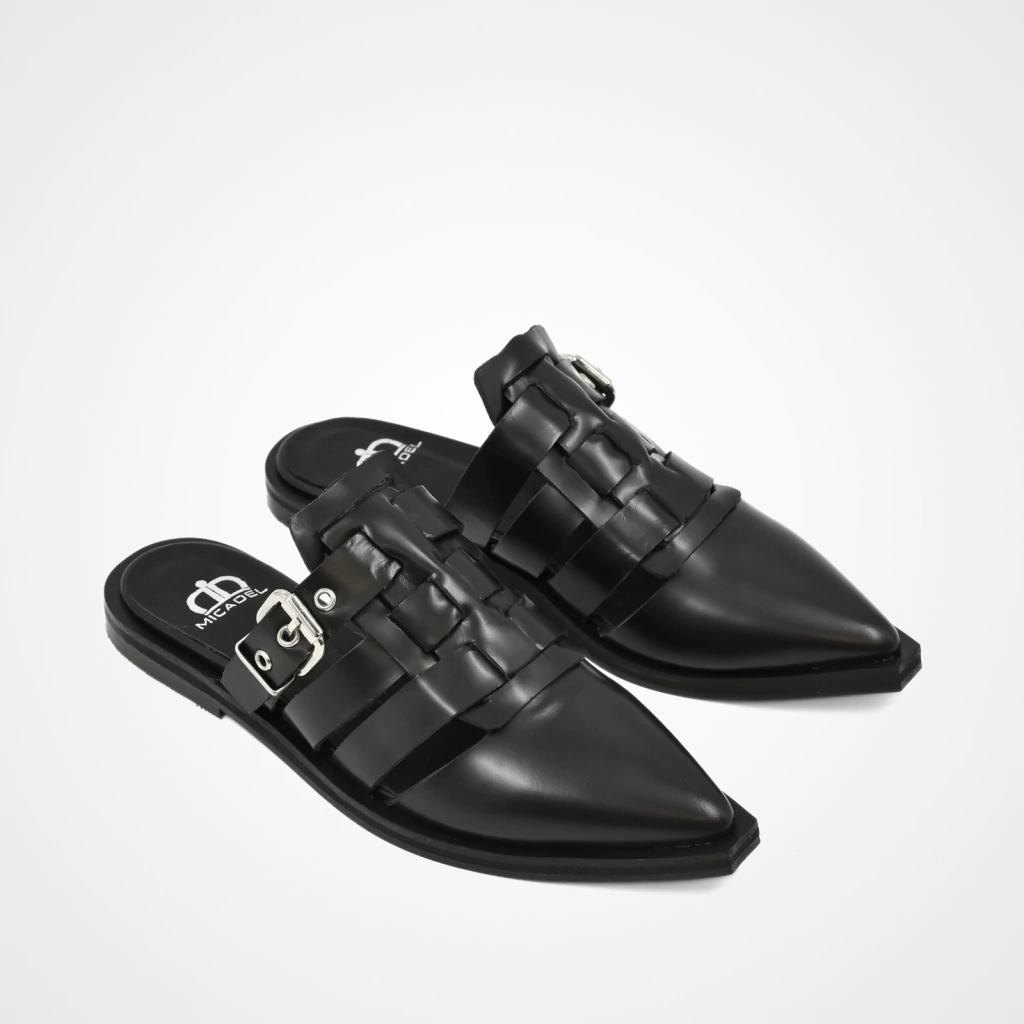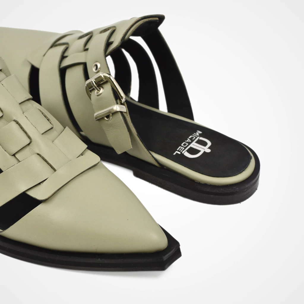 El zueco Dakota en color selva combina diseño artesanal y estilo contemporáneo. Su trama tejida en cuero 100% vacuno aporta textura y personalidad.